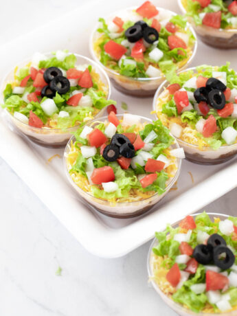 These fun, individual 7 layer dip cups with meat are made with creamy refried beans, seasoned taco meat, a blend of cheeses, and topped with crisp lettuce, freshly diced tomatoes, onions and garnished with...