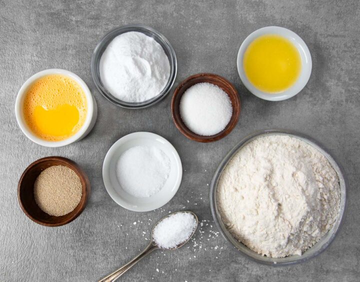 - Uses just simple baking ingredients such as flour, sugar, yeast, salt, butter baking soda and egg.